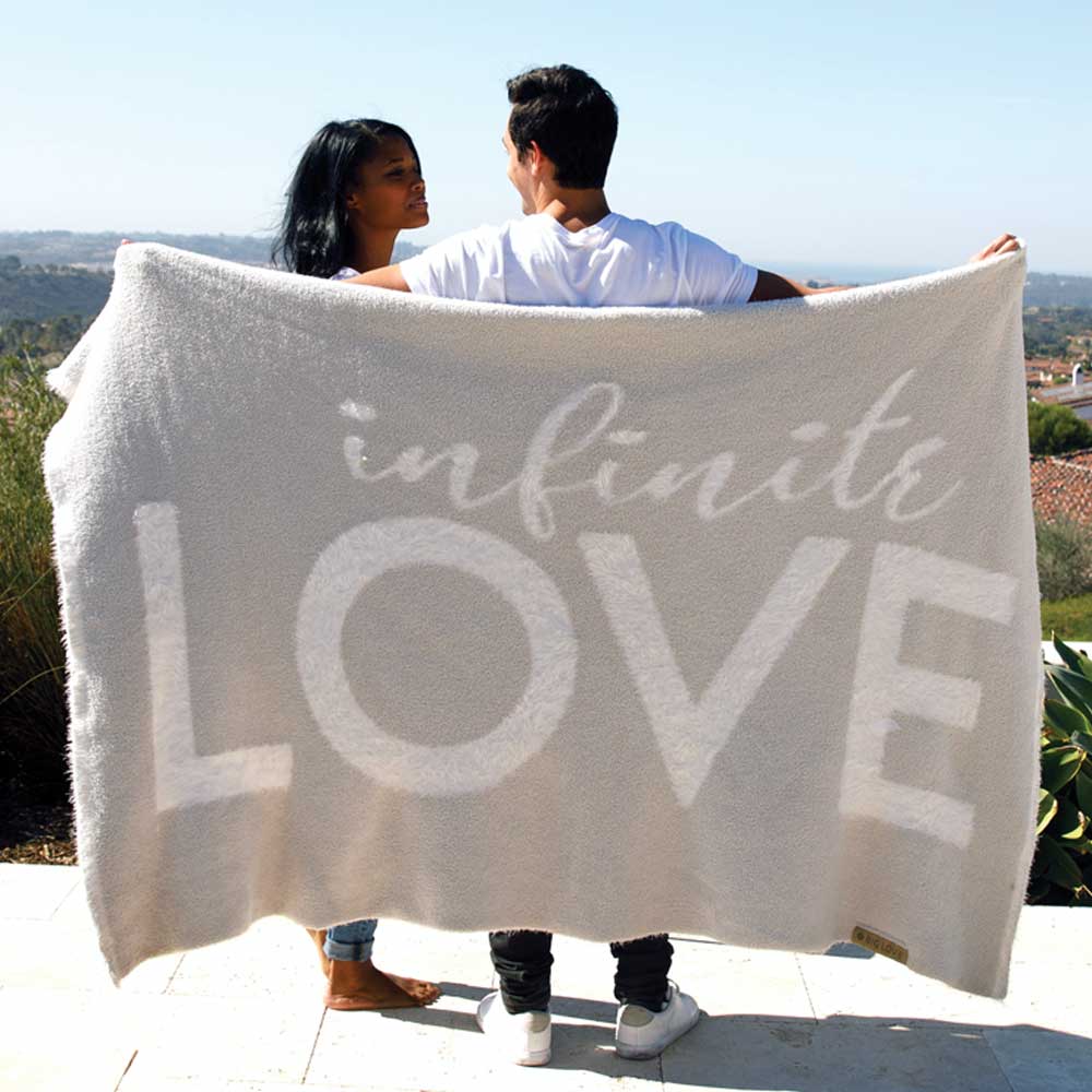 The light gray blanket has a gorgeous custom script "Infinite LOVE" that pops off the blanket in white, feathered fluff. Knitted with our signature micro-chenille and feather yarn combo, making it the silkiest, softest blanket perfect for wrapping up in love.